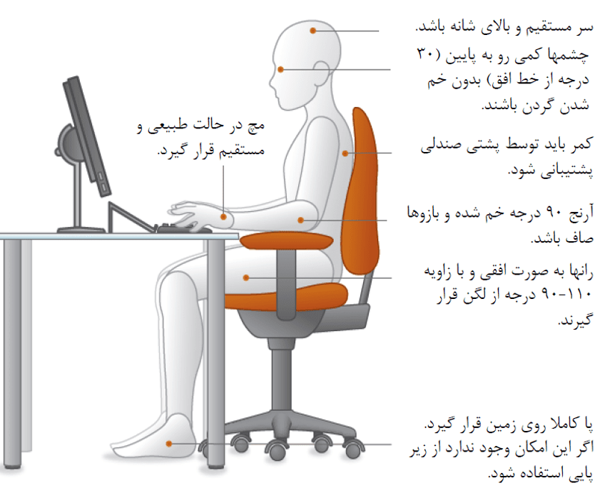 جهت جلوگیری از مشکلات ناشی از پشت میز نشینی طولانی مدت کارکنان اداری و استفاده از کامپیوتر بهتر است ، ارگونومی صحیح نشستن را رعایت نمایید.
