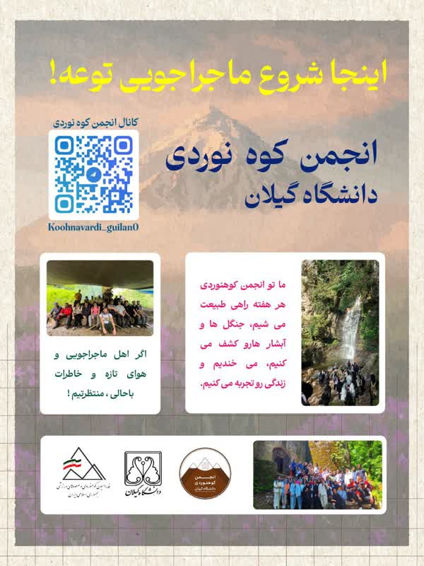 دانشجویان گرامی جهت شرکت در برنامه های هفتگی انجمن کوهنوردی دانشگاه گیلان از طریق بار کد داخل پوستر وارد و پس از عضویت در انجمن از برنامه های کوهنوردی استفاده نمائید .