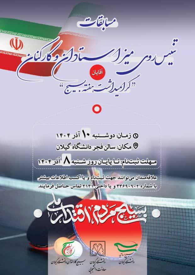 *بسیج دانشجویی دانشکده تربیتبدنی و علومورزشی دانشگاه گیلان با همکاری هیئت ورزشهای دانشگاهی استان گیلان برگزار میکند: «مسابقات قهرمانی تنیـــس روی میز دانشگاههای گیــلان» مهلت ثبتنام: آقایــان: تا 3 آذر بانــوان: تا 11 آذر ثبتنام