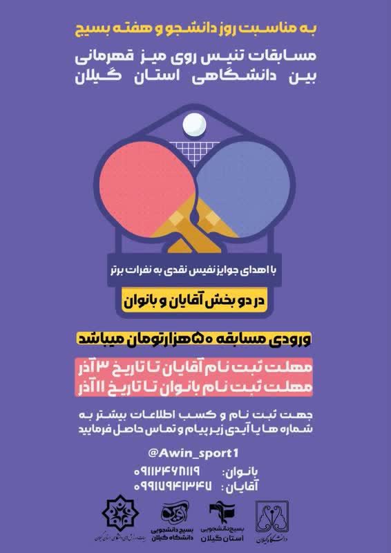 *بسیج دانشجویی دانشکده تربیتبدنی و علومورزشی دانشگاه گیلان با همکاری هیئت ورزشهای دانشگاهی استان گیلان برگزار میکند: «مسابقات قهرمانی تنیـــس روی میز دانشگاههای گیــلان» مهلت ثبتنام: آقایــان: تا 3 آذر بانــوان: تا 11 آذر ثبتنام