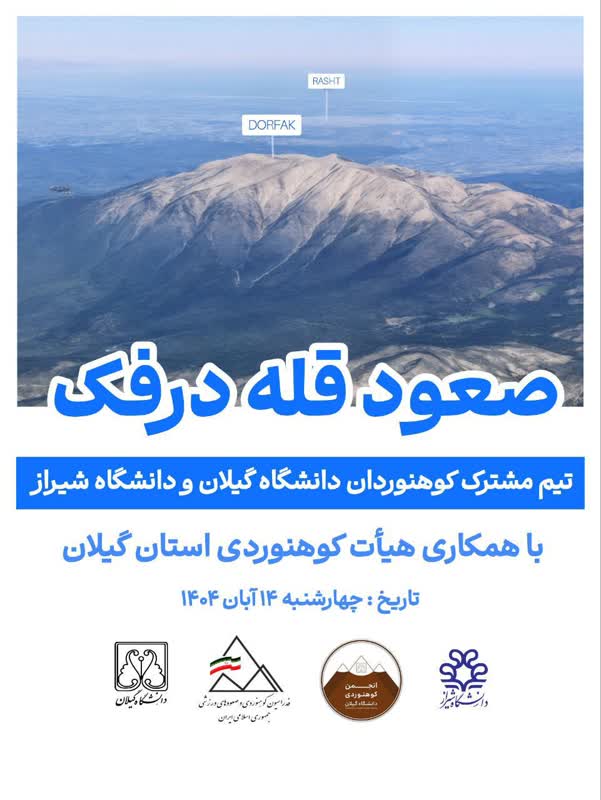 صعود به قله درفک با تیم مشترک کوهنوردان دانشگاه گیلان و دانشگاه شیراز ( متشکل از 24 نفر از اعضاء هیات علمی و کارکنان هر دو دانشگاه ) در روز چهارشنبه تاریخ 1404/8/14 انجام می گیرد