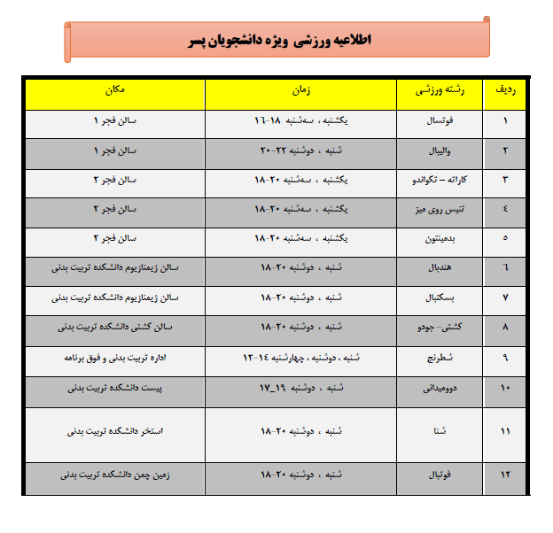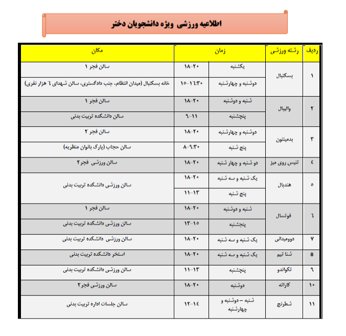 به اطلاع کلـیه دانشجویان محترم  می رساند  فعالیت رشته های  ورزشـی ذیل از تاریخ  1404/7/19 آغاز می گردد. از عموم دانشجویان علاقه مند به شرکت در تمرینات این رشته ها دعوت به عمل می ‏آید در ساعات فوق برنامه به مربیان مربوطه مراجعه نمایند.
